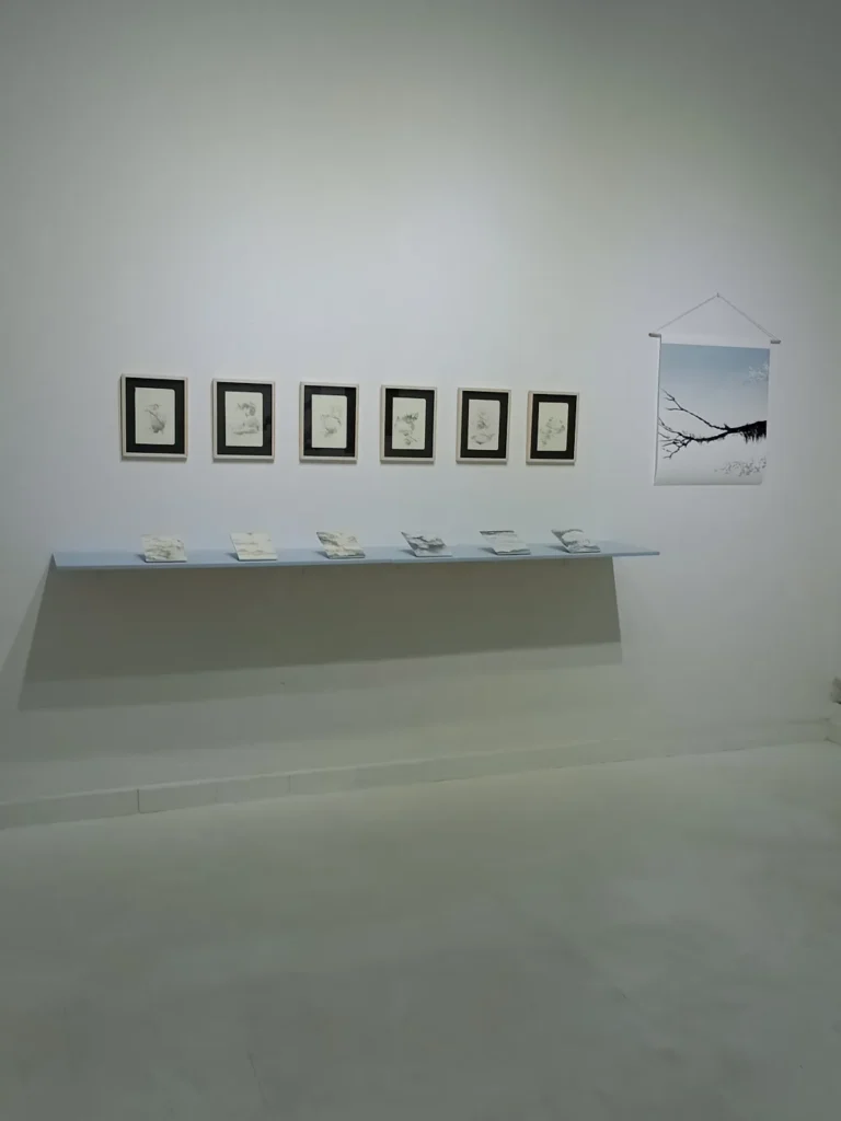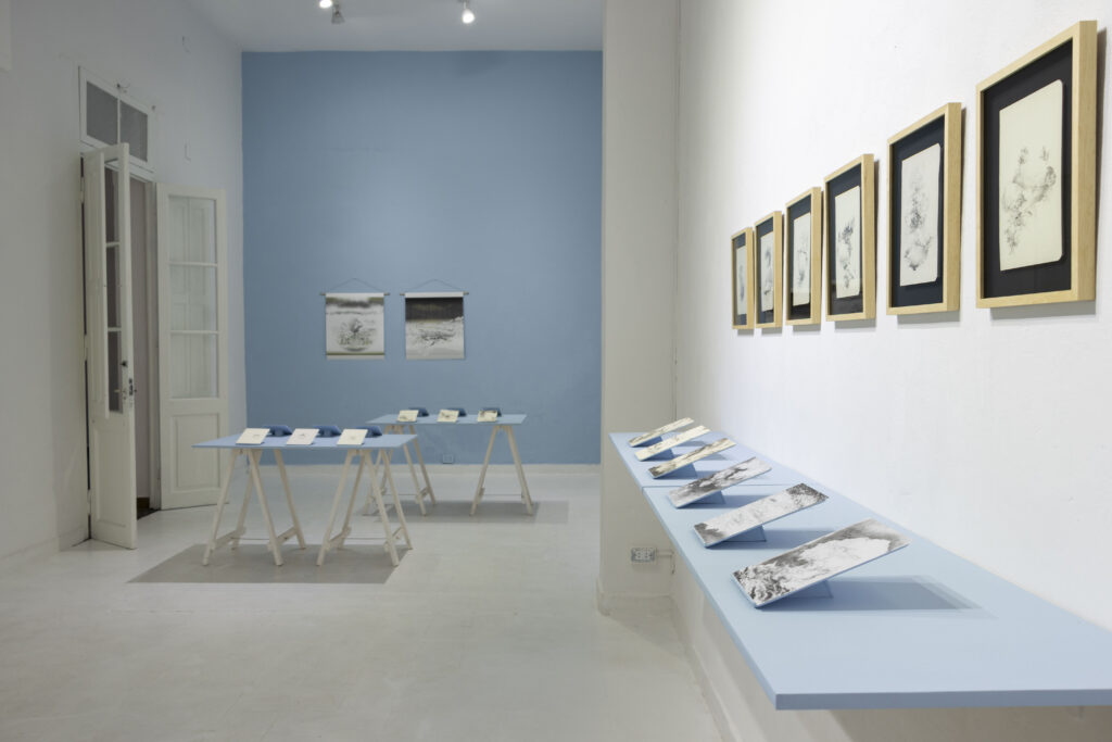 Dos realidades, pero también dos escalas. Aunque esto se vuelve palpable un poco después —porque el tacto también reclama su lugar—, hay en la disposición algo que interrumpe la continuidad entre lo grande, incluso lo descomunal, y lo pequeño: el paisaje y el primerísimo primer plano. Nombres como “delicadeza” y “cientificidad” apuntalan esa ambivalencia sin resolverla. Por un lado, la extrema fragilidad de las obras parece demandar la luz fría y el espacio blanco —también celeste— que las protege. Por otro, el dispositivo expositivo proyecta una cierta aura de laboratorio, como si estuviéramos en una sala de museo de ciencias. Esa es la impresión. La primera.
