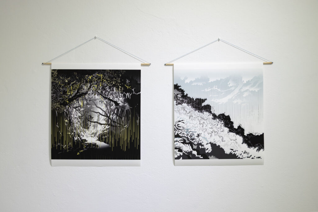 Apunte, bitácora, impresión: en todos los casos, lo que emerge son paisajes, fragmentos, detalles. Un árbol, una rama, un charco, un grupo de piedras rodeadas de vegetación. El Reino que en un principio parecía homogéneo está poblado por una sorprendente multiplicidad. Al desplegarse ante la mirada, uno queda perplejo. Paisajes, sí, pero ¿cuántas formas de dejarse afectar por el espacio caben en esa palabra? El paisaje de la travesía, el de la memoria de naturalistas y paisajistas tucumanos, el de los escenarios infográficos de los mass media y el del manga, todos circulando en un scroll interminable. Y también, claro, el paisaje del arte mismo, de las artes visuales, que es el paisaje de las imágenes. Me detengo. ¿Es el espacio de la galería un paisaje? Me detengo porque hay más.