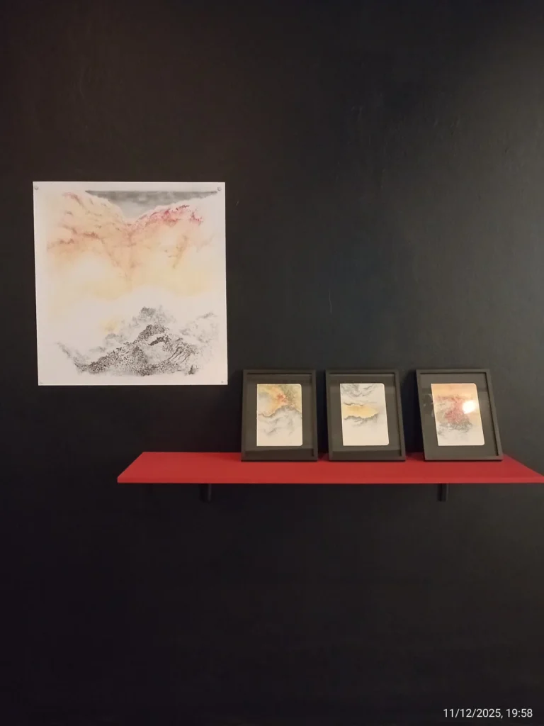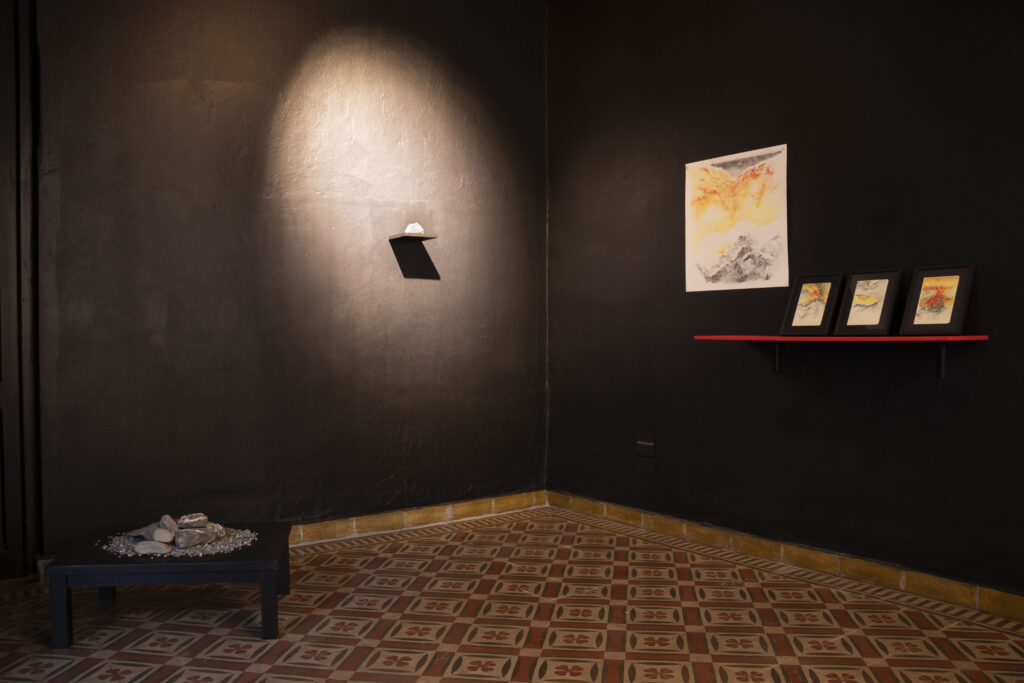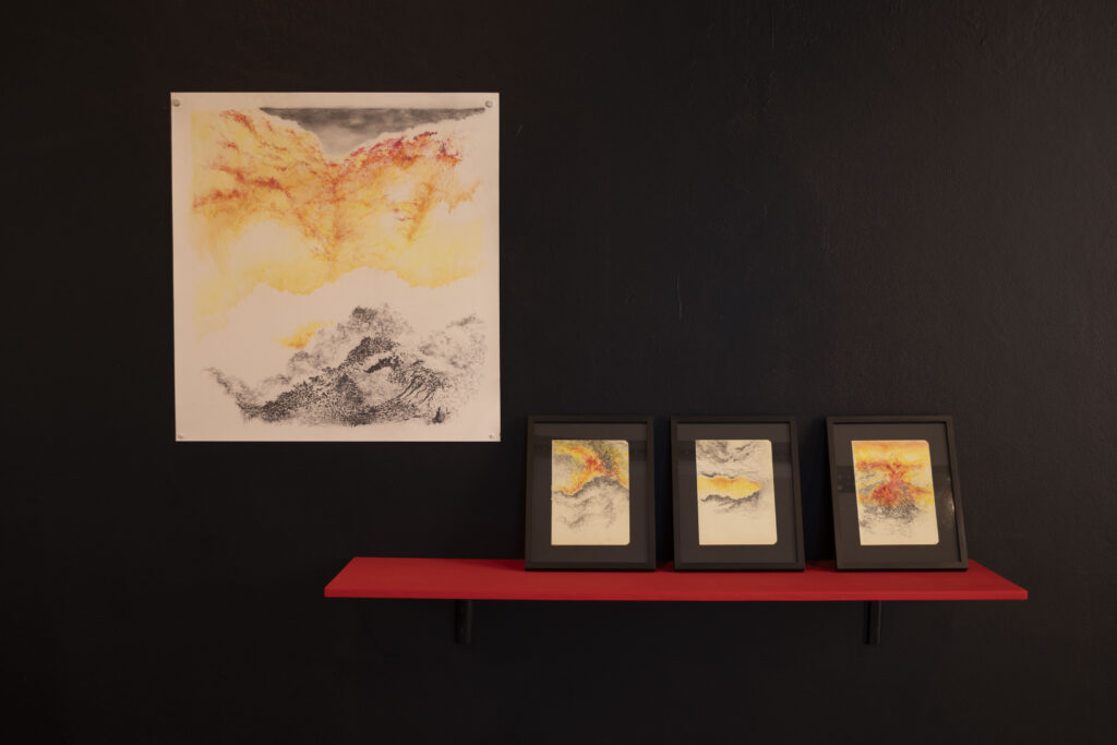 Dos paredes negras y una iluminación más escénica, si cabe la expresión. Un dibujo de gran formato en la pared. Dos tintas: negra y rojo anaranjado, con todos sus matices. A su lado, tres dibujos bicolores, también rojos, enmarcados y apoyados en un estante del mismo tono. Se impone la intensidad del color. ¿Es el cielo, un incendio, un volcán? El contraste con el espacio anterior es tal que poco importa la referencia. Lo que importa es que otro régimen de luz reina aquí. Otra intensidad modifica el lugar de la mirada, es decir, el lugar del cuerpo en el paisaje. Si antes el dispositivo parecía proteger una cierta fragilidad de la imagen, ahora todo ocurre como si la distancia hubiera desaparecido y el cuerpo que mira quedara expuesto a un paisaje que arde. Metafóricamente, pero arde. Quizás el montaje quiera dar testimonio de esto: casi en penumbras, una mesa con piedras parece atestiguar nuestra presencia en ese territorio.